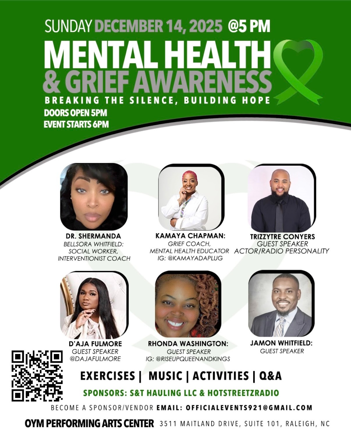 A mental health and grief awareness event will be taking place on Sunday, December 14 at 5pm at the OYM Performing Arts Center in Raleigh, NC! Sponsored by S&T Hauling LLC and HotStreetzRadio, the event will have exercises, music, activities and a Q&A section. Click here to buy tickets and learn more!